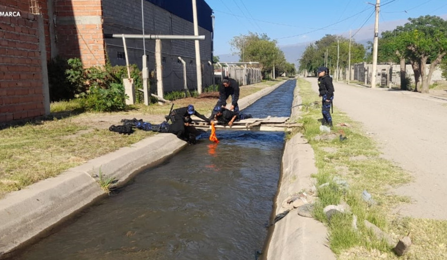 A las 09:25 de la mañana de hoy, mientras numerarias de la Unidad Femenina de Infantería (UFI), perteneciente a la Jefatura de Zona Norte, realizaban recorridos de prevención por inmediaciones a un canal de riego existente en la localidad de Sumalao, Departamento Valle Viejo, se percataron que un perro estaba siendo arrastrado por la corriente de agua.