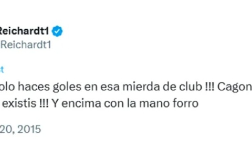 “Messi puto solo haces goles en esa mierda de club !!! Cagon en la Argentina no existis !!! Y encima con la mano forro”, fue la publicación de Reichardt en diciembre de 2015, cuando Messi convirtió en un encuentro con el Barcelona.