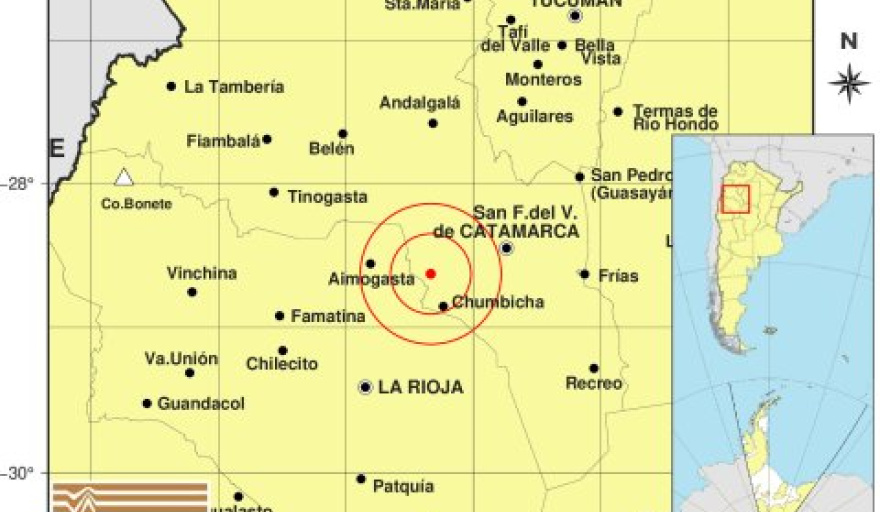 Epicentro: 26 km al N de Chumbicha; 47 km al E de Aimogasta; 57 km al O de Catamarca -28.63 (lat) -66.334 (long)