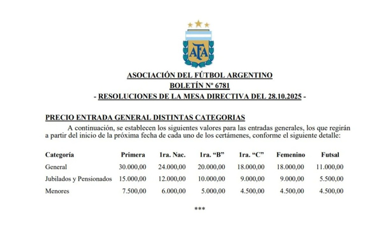 En la segunda categoría del fútbol local, la General aumenta de 18.500 a 24.000 pesos. En Primera B, el valor se fija en 20.000 pesos. Tanto en Primera C como en el fútbol femenino, la entrada General queda en 18.000 pesos. El futsal registra un precio de 11.000 pesos para el acceso más económico.