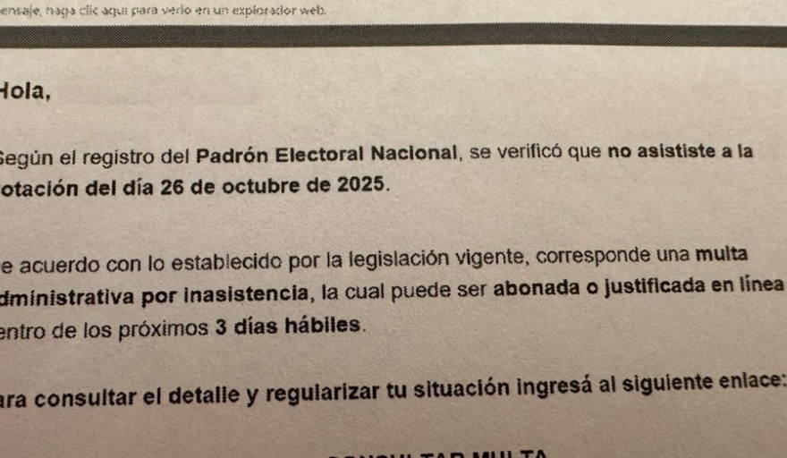 "Hola. Según el registro del Padrón Electoral Nacional, se verificó que no asististe a la votación del día 26 de octubre de 2025. De acuerdo con lo establecido por la legislación vigente, corresponde una multa administrativa por inasistencia, la cual puede ser abonada o justificada en línea dentro de los próximos 3 días hábiles", reza el texto que está llegando a casillas aleatorias esta semana.
