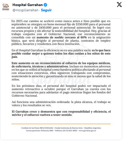 Tras esto, el hospital comentó que ahora, «gracias al trabajo conjunto con el Gobierno Nacional», recibieron un «aumento de sueldo cercano al 60% en la asignación básica» el cual será dirigido «al personal de la planta, contratos de empleo público, becarios y residentes con Beca Institución».