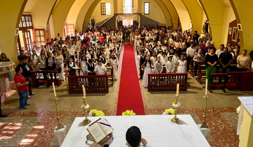 La celebración litúrgica fue presidida por el párroco, padre Eugenio Pachado, quien animó a los niños a “alimentarse siempre de la Eucaristía, y a los padres a acercarse con sus hijos a la Misa dominical, comer el Cuerpo y beber la Sangre de Nuestro Señor Jesucristo, que les puedan enseñar con su testimonio a amar a Dios”.