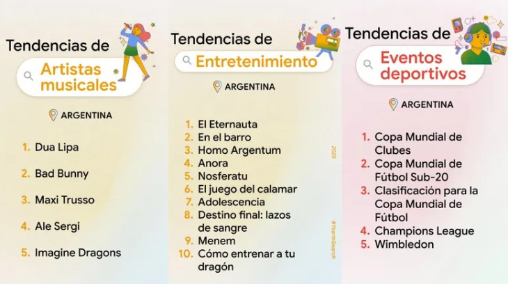 Google presentó "El año en búsquedas", un resumen anual que analiza cuáles fueron los términos que despertaron mayor interés en el Buscador durante 2025 en la Argentina. Las competencias deportivas, algunos temas políticos y figuras públicas ocuparon un lugar primordial dentro de las listas.