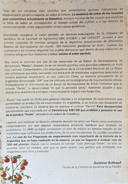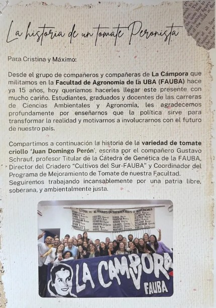 La pieza central del relato es la historia de la variedad del tomate criollo bautizada "Juan Domingo Perón", escrita por Gustavo Schrauf, titular de la cátedra de Genética de FAUBA."La narración es un testimonio más de las oportunidades generadas por Argentina que (por anteojeras ideológicas) se pierden en nuestro país y terminan siendo aprovechadas por los de afuera… nada nuevo bajo el sol", escribió la exmandataria.