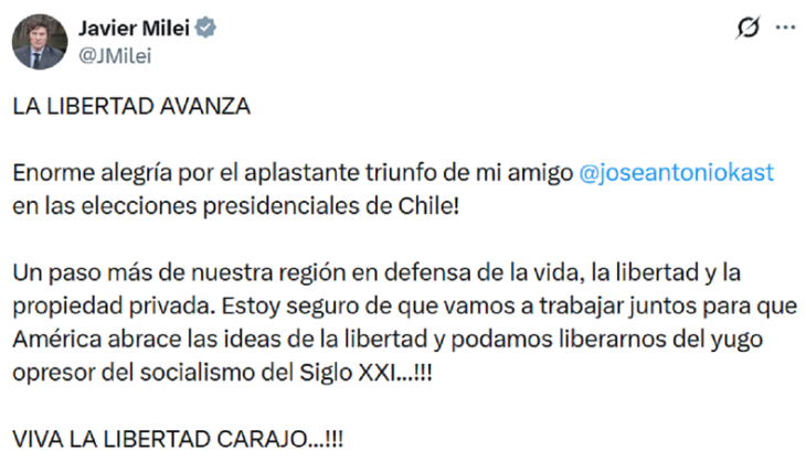En su cuenta de la red social X, Milei festejó la victoria de Kast en el país trasandino y el avance de la derecha: "¡Enorme alegría por el aplastante triunfo de mi amigo José Antonio Kast en las elecciones presidenciales de Chile! Un paso más de nuestra región en defensa de la vida, la libertad y la propiedad privada".