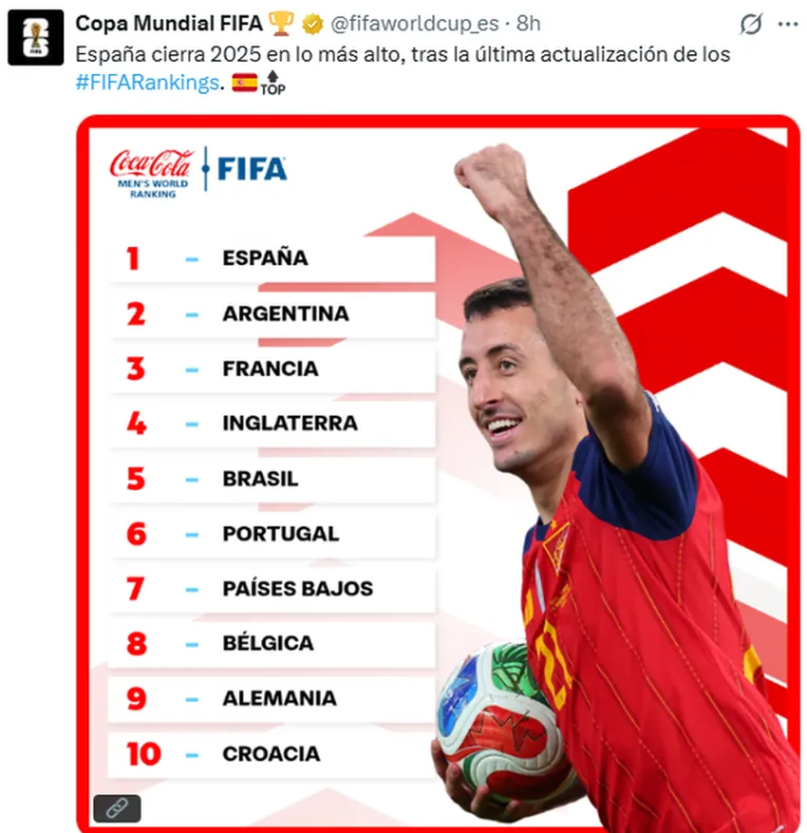 El listado se mantiene sin cambios desde septiembre, cuando la Albiceleste cedió la cima luego de dos años de liderazgo. De esta manera, el cruce entre España y Argentina en la próxima Finalissima, prevista para marzo en Qatar, enfrentará a los dos mejores seleccionados del mundo según la clasificación oficial.