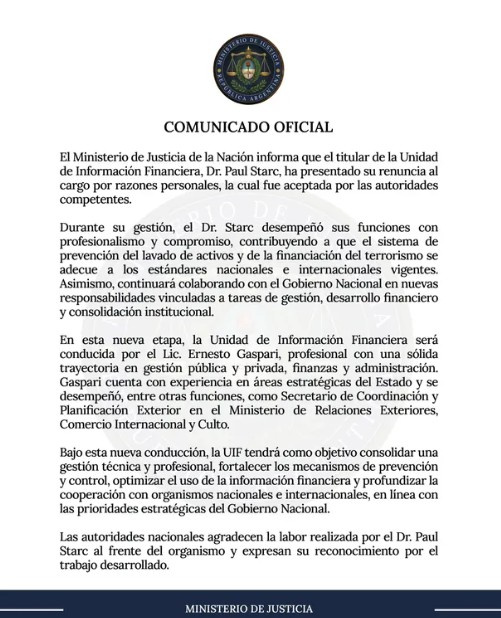 El Ministerio de Justicia de la Nación confirmó este jueves un cambio estratégico en el organigrama oficial. El titular de la UIF, Paul Starc, presentó su renuncia al cargo invocando motivos estrictamente personales, la cual fue aceptada de inmediato por las autoridades competentes. Según se informó en el comunicado oficial, su lugar será ocupado por el licenciado Ernesto Gaspari.