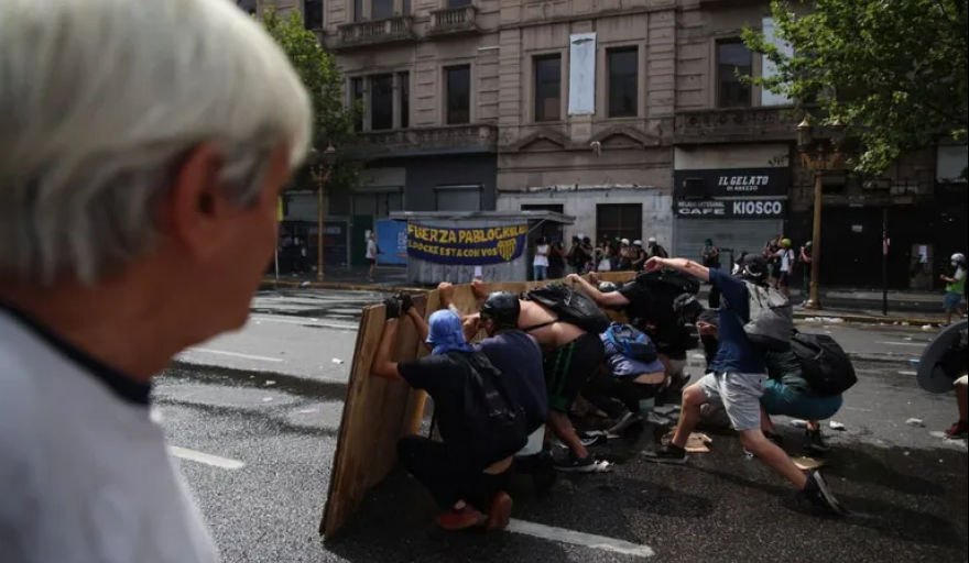 Frente al vallado dispuesto por el operativo policial sobre Rivadavia, se desató una violenta batalla entre un grupo de manifestantes encapuchados y la Policía Federal. Piedras, balas de goma y gases fueron de un lado al otro. Las fuerzas de seguridad accionaron la ofensiva mediante un cordón policial para contener el avance de las organizaciones y trabajadores que llegaron de manera voluntaria sin bandera política y que, hasta ese momento, se manifestaban en calma.