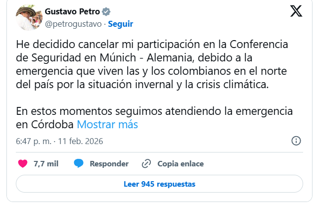 La gravedad de la situación obligó al presidente Gustavo Petro a cancelar su viaje a Alemania para participar en la Conferencia de Seguridad de Múnich. A través de su cuenta oficial, el mandatario anunció: “He decidido cancelar mi participación en la Conferencia de Seguridad, debido a la emergencia que viven las y los colombianos en el norte del país por la situación invernal y la crisis climática”