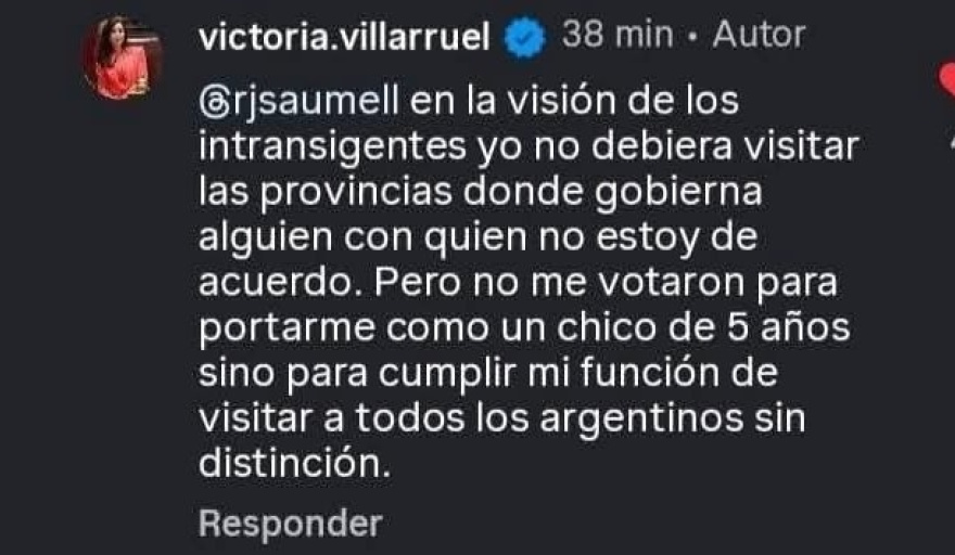 En ese sentido, Victoria Villarruel les respondió "en la visión de los intransigentes yo no debería visitar a las provincias donde gobierna alguien con quien no estoy de acuerdo. Pero no me votaron para comportarme como un chico de 5 años, sino para cumplir mi función de visitar a todos los argentinos sin distinción".