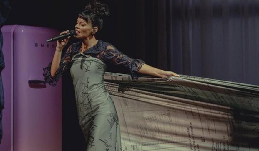 La artista británica sorprendió al público al presentar un vestido exclusivo que no solo era una elección estética, sino que estaba confeccionado con recibos de compras reales que Harbour habría realizado para otras mujeres durante su matrimonio. Este detalle ha generado gran revuelo en redes sociales, donde las imágenes de su atuendo se han viralizado rápidamente.
